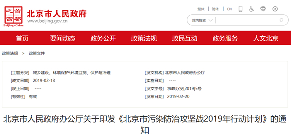 北京市发布《北京市污染防治攻坚战2019年行动计划》(下称“行动计划”)。行动计划对蓝天、碧水、净土三大保卫战的2019年任务措施进行了总体布局,旨在统筹生态环境系统保护,全面推进生态环境精治、法治、共治。11月1日起,全天禁止所有国三排放标准柴油载货汽车进入本市行政 [详细]