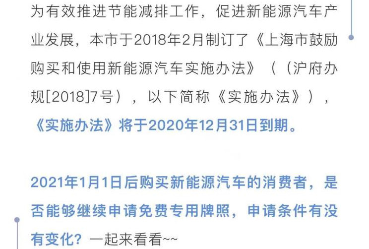 上海发改委称,《实施办法》将于2020年12月31日截止,为确保政策的连续性,继续支持本市消费者购买和使用新能源汽车,经研究,2021年1月1日起至2021年2月28日,上海市继续免费发放新能源汽车专用牌照额度,消费者在上述期限内在本市购买新能源汽车用于非营运,且符合《实施办法》有关标准和要求的,可通过原渠道和程序申领。具体信息可向各大新能源汽车经销商咨询。