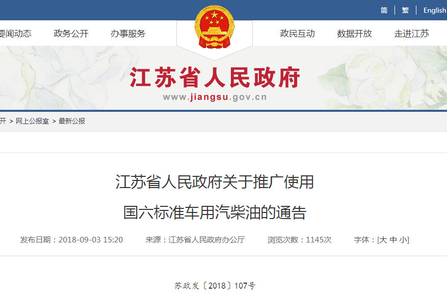9月25日获悉,江苏省政府公布了关于推广使用国六标准车用汽柴油的通告:2018年10月1日零时起,南京等行政区域内的加油站(点)开始销售国六标准车用汽油,全省行政区域内的加油站(点)停止销售普通柴油和低于国六标准的车用汽油、车用乙醇汽油和车用柴油。 [详细]