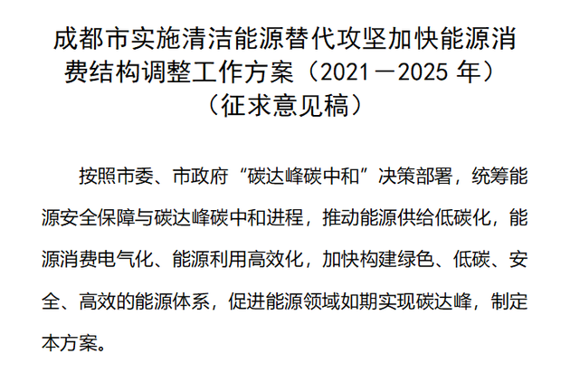 易车讯近日,成都市发布《成都市实施清洁能源替代攻坚加快能源消费结构调整工作方案(2021-2025年)(征求意见稿)》,正向社会公开征求意见。