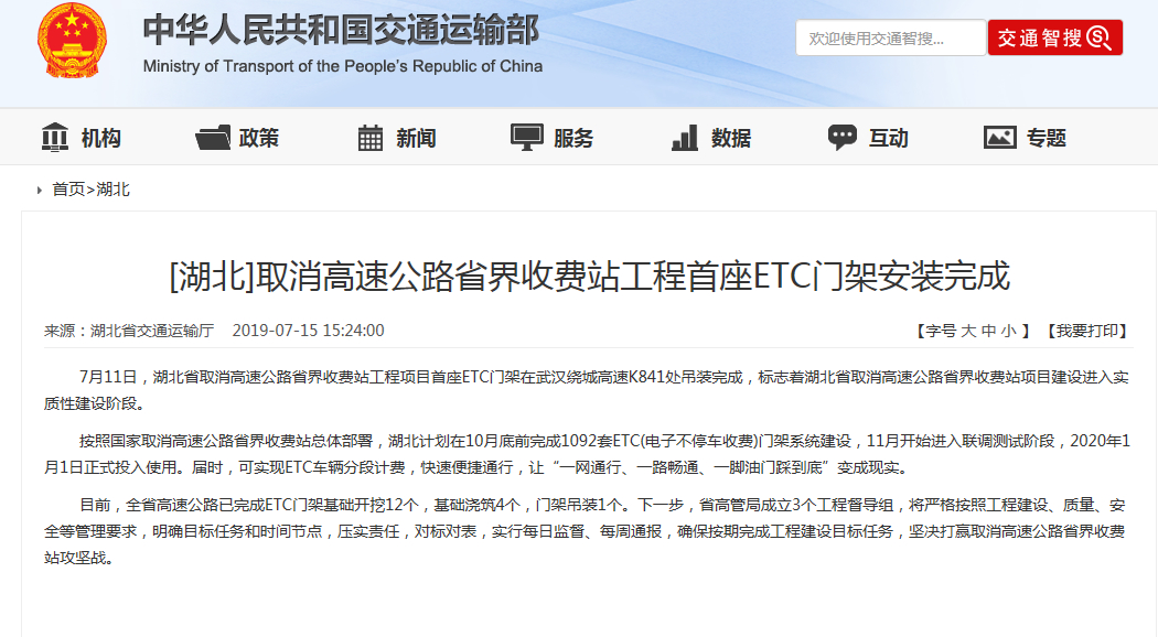 7月11日,湖北省取消高速公路省界收费站工程项目首座ETC门架在武汉绕城高速K841处吊装完成,标志着湖北省取消高速公路省界收费站项目建设进入实质性建设阶段。按照国家取消高速公路省界收费站总体部署,湖北计划在10月底前完成1092套ETC(电子不停车收费)门架系统建设,11月开始进入联调测试阶段,2020年1月1日正式投入使用。届时,可实现ETC车辆分段计费,快速便捷通行,让“一网通行、一路畅通、一脚油门踩到底”变成现实。 [详细]