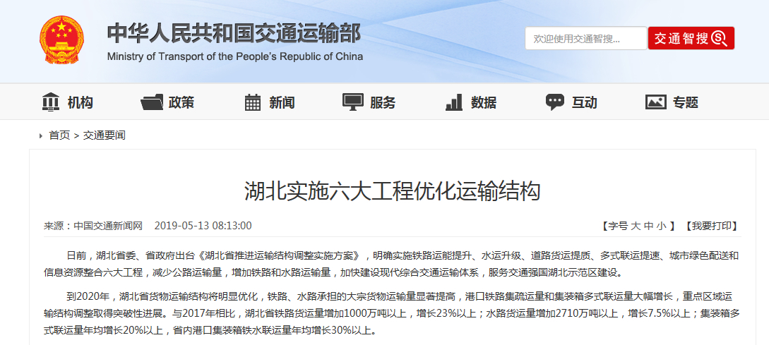 湖北实施六大工程优化运输结构