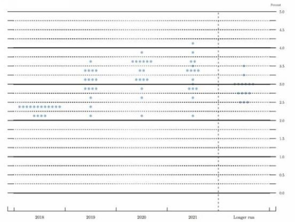在点阵图方面,美联储维持2018年加息四次(重申12月加息预期)、2019年加息三次、2020年加息一次的预期不变,首次公布的2021年点阵图表明2020年之后不会加息。中值预测显示,2018年底联邦基金利率料为2.375%;2019年底联邦基金利率料为3.125%;2020年底联邦基金利率料为3.375%;皆与6月预期持平;2021年底联邦基金利率料为3.375%。