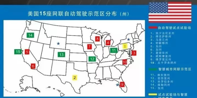 图中红色标示(以及黄色标示的2)是美国交通部指定的十大自动驾驶试验场分布地,资料来源:VehicleTrend《美国15座网联自动驾驶测试示范区评价排名》