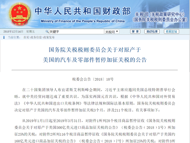 在二十国集团领导人布宜诺斯艾利斯峰会期间,习近平主席应邀同美国总统特朗普举行会晤,就中美经贸问题达成了重要共识。为落实两国元首共识,根据《中华人民共和国对外贸易法》《中华人民共和国进出口关税条例》等法律法规和国际法基本原则,国务院关税税则委员会决定对原产于美国的汽车及零部件暂停加征关税3个月,涉及211个税目。有关事项如下: