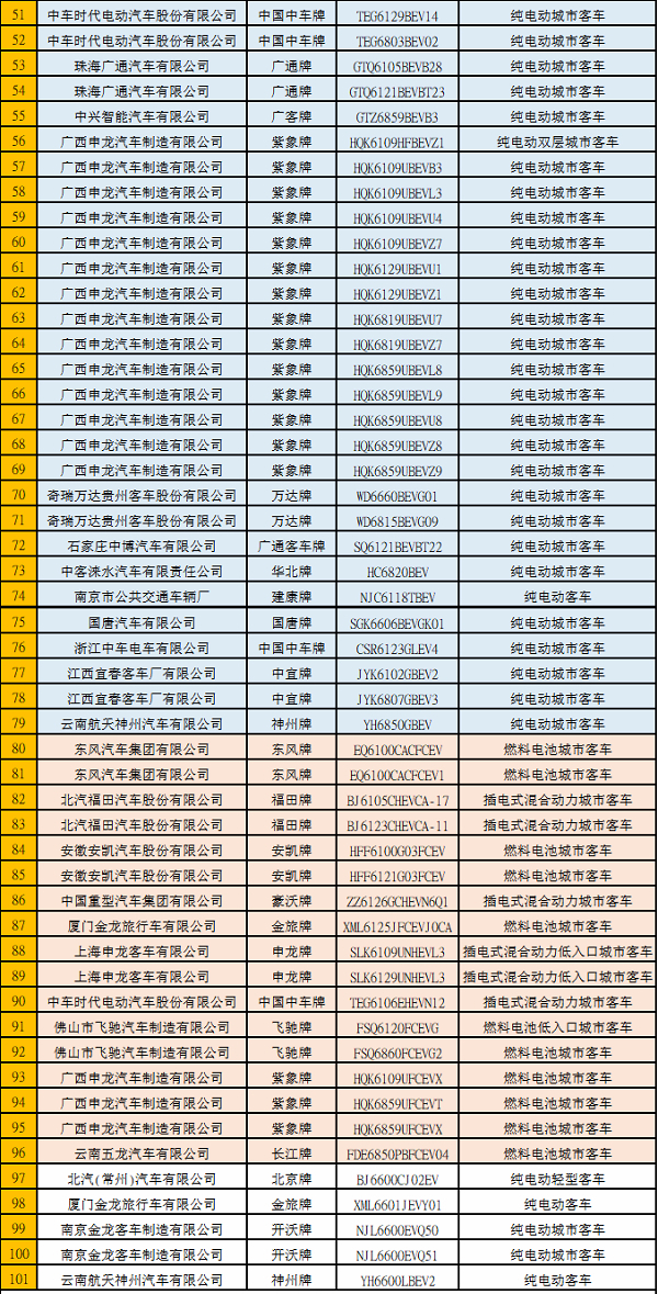 在101款新能源客车中,有6款插电式混合动力客车,福田和申龙各有2款,中国重汽和中车电动各有1款。