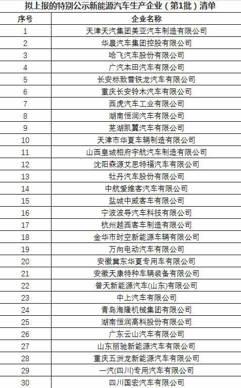 9月3日,工信部发布了关于对拟上报《特别公示新能源汽车生产企业 (第1批)》企业清单进行公示的通知。
