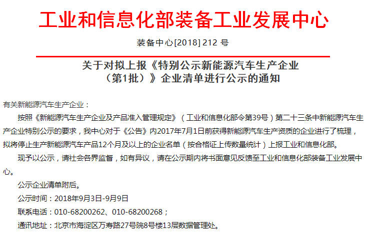 通知称,按照《新能源汽车生产企业及产品准入管理规定》(工业和信息化部令第39号)第二十三条中新能源汽车生产企业特别公示的要求,装备部工业发展中心对于《公告》内2017年7月1日前获得新能源汽车生产资质的企业进行了梳理,拟将停止生产新能源汽车产品12个月及以上的企业名单(按合格证上传数量统计)上报工业和信息化部。