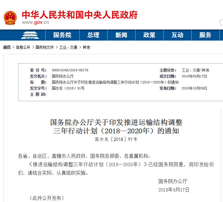 近日,国务院办公厅印发了《推进运输结构调整三年行动计划(2018-2020年)》(以下简称《行动计划》)。