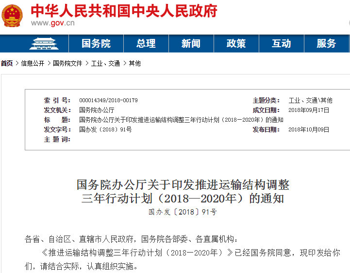 近两年,国家一直在致力推进运输结构调整。公转铁,公转水,会对公路货运产生很大影响,事关几千万货车司机的利益。最近,调整运输结构又有新动作了。2018年10月9日,国务院下发《关于印发推进运输结构调整三年行动计划(2018—2020年)的通知》。