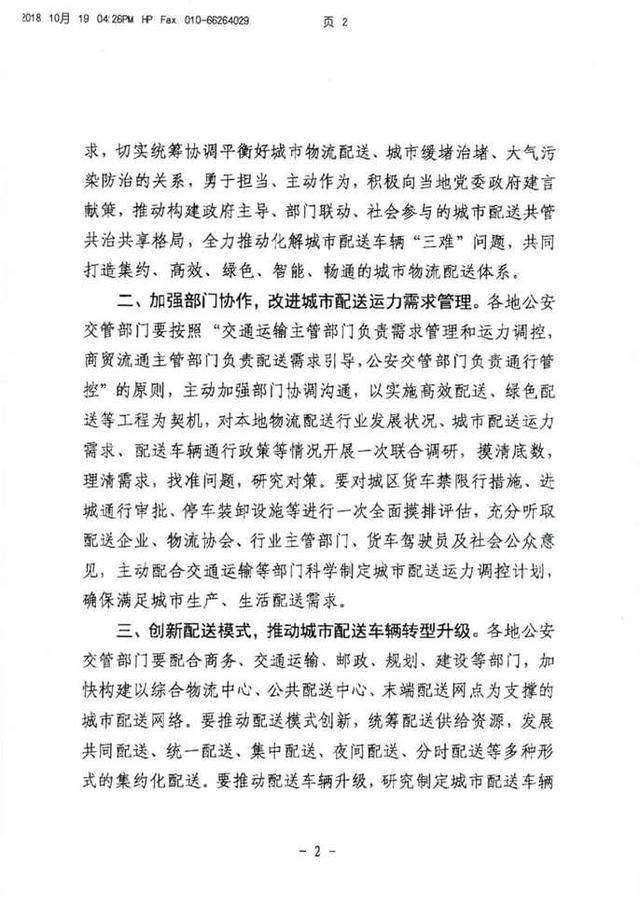 10月21日,中华人民共和国公安部印发了关于进一步规范和优化城市配送车辆通行管理的通知,全文如下: