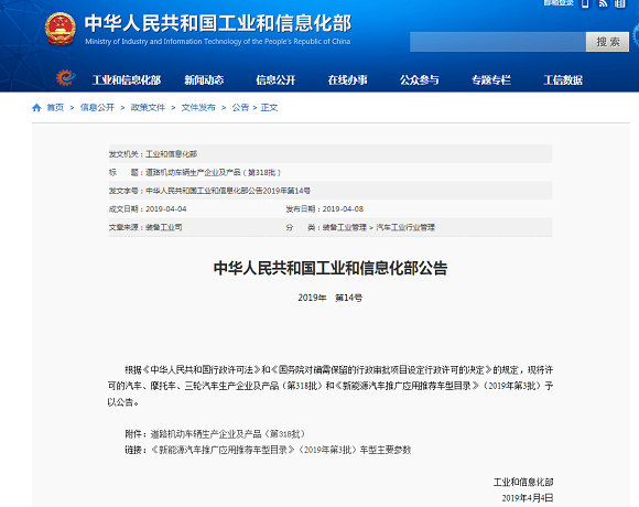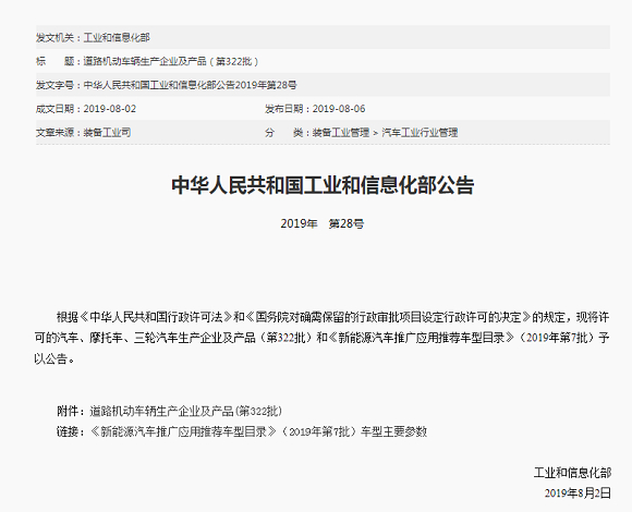 工信部第319批《道路机动车辆生产企业及产品公告》