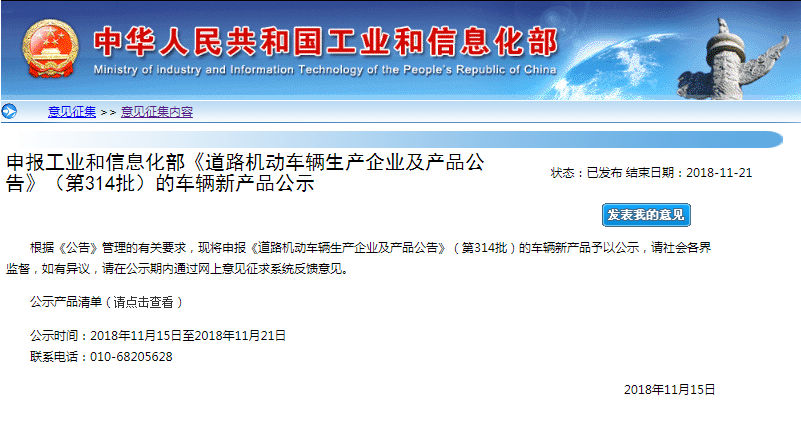 11月15日,工信部对申报第314批《道路机动车辆生产企业及产品公告》(简称“新车公告”)的车辆新产品进行了公示,公示期7天,截止到11月21日。