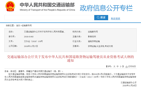 一周之内,也就是在2018年11月26日,交通部又发布了《中华人民共和国道路货物运输驾驶员从业资格考试大纲》,该大纲自2019年1月1日起施行。根据《通知》: