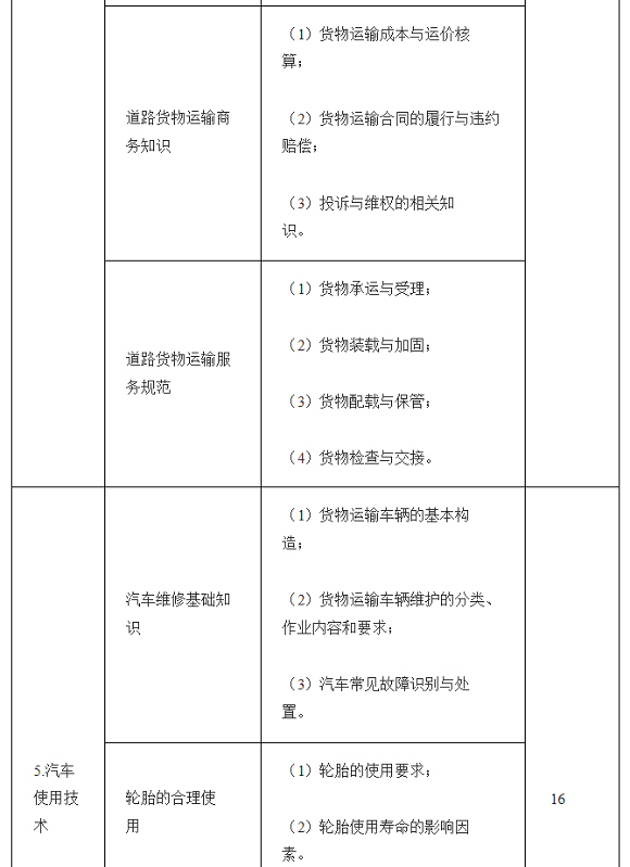 此外,相比于2012年的考试大纲,新版的大纲增加了禁运物品查验、货物捆绑的评分。(注:众所周知,普货、旅客、危险品的驾驶员都是需要从业资格证的,此次新发布的大纲只适合普通经营性货运驾驶人员,从事危险货物和放射性货物运输的驾驶人员从业资格考试大纲另行规定。)
