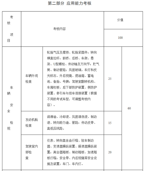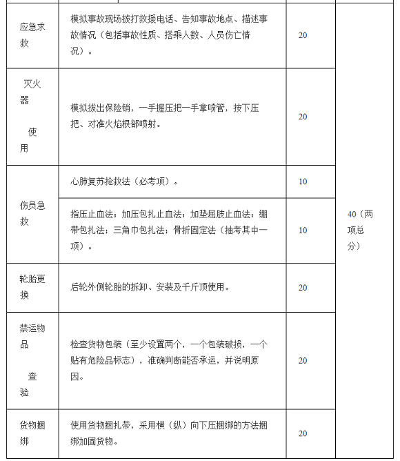 2、应用能力考核总分为100分,分为车辆安全检视、应急求救、灭火器使用、伤员急救、轮胎更换、禁运物品查验、货物捆绑七项。其中,车辆安全检视为必考项,其他六个项目为抽考项(随机抽取六个项目中的两项)考核时间为40分钟。