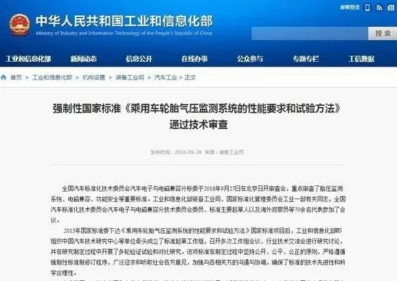 日前《乘用车轮胎气压监测系统的性能要求和试验方法》(GB26149)强制性国家标准送审稿通过了工业和信息化部审查,经修改完善上报国家标准委批准后将正式发布实施。