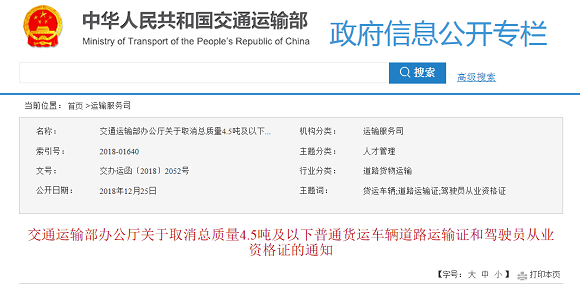 2018年12月25日,交通运输部办公厅发布《关于取消总质量4.5吨及以下普通货运车辆道路运输证和驾驶员从业资格证的通知》,自2019年1月1日起,各地交通运输管理部门不再为总质量4.5吨及以下普通货运车辆配发道路运输证。对于总质量4.5吨及以下普通货运车辆从事普通货物运输活动的,各地交通运输管理部门不得对该类车辆、驾驶员以“无证经营”和“未取得相应从业资格证件,驾驶道路客货运输车辆”为由实施行政处罚。
