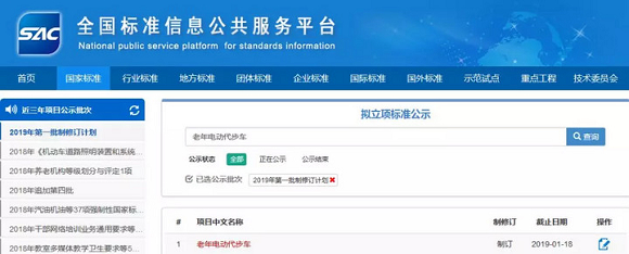 2019年1月3日,国家标准委正式对1537项拟立项国家标准项目公开征求意见,其中包括《老年电动代步车标准》,征求意见截止时间为2019年1月18日。