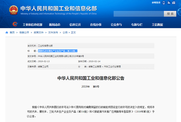 工信部发布道路机动车辆生产企业及产品(第316批)公告