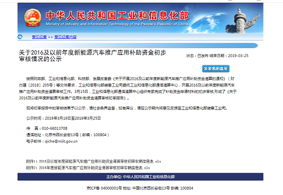 2019年3月18日,工信部公示了2016及以前年度新能源汽车推广应用补助资金初步审核情况,公示时间为2019年3月19日至3月25日。