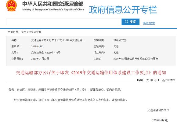 交通部《2019年交通运输信用体系建设工作要点》的通知