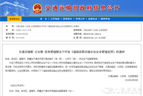 5月3日,交通部联合公安部和应急管理部发布《道路旅客运输企业安全管理规范》的通知。交通部指出,为深入贯彻落实《中华人民共和国安全生产法》《中华人民共和国道路交通安全法》《中共中央 国务院关于推进安全生产领域改革发展的意见》等法律、行政法规和文件要求,深刻汲取重特大道路运输事故教训,进一步规范道路旅客运输企业安全生产管理,交通运输部、公安部、应急管理部坚持问题导向,立足发展实际,共同修订了《道路旅客运输企业安全管理规范》。请结合实际抓好贯彻落实。