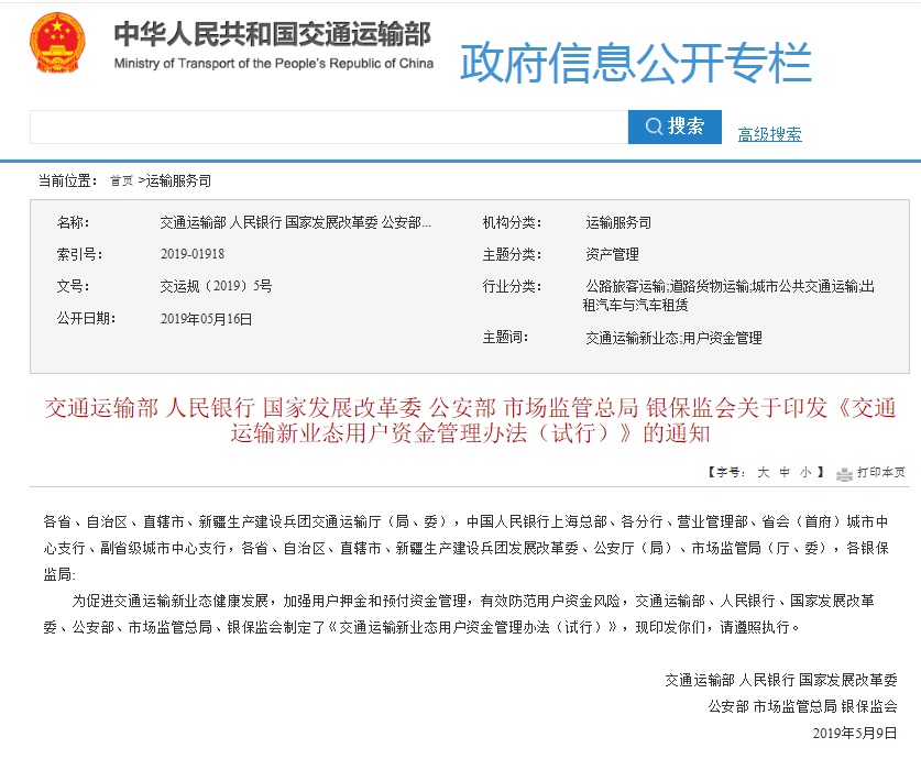 5月16日,交通运输部 人民银行 国家发展改革委 公安部 市场监管总局 银保监会关于印发《交通运输新业态用户资金管理办法(试行)》的通知。