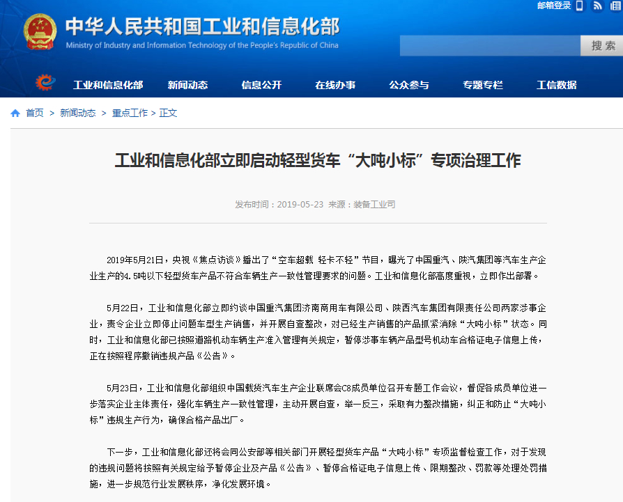 2019年5月21日,央视《焦点访谈》播出了“空车超载 轻卡不轻”节目,曝光了中国重汽、陕汽集团等汽车生产企业生产的4.5吨以下轻型货车产品不符合车辆生产一致性管理要求的问题。工业和信息化部高度重视,立即作出部署。