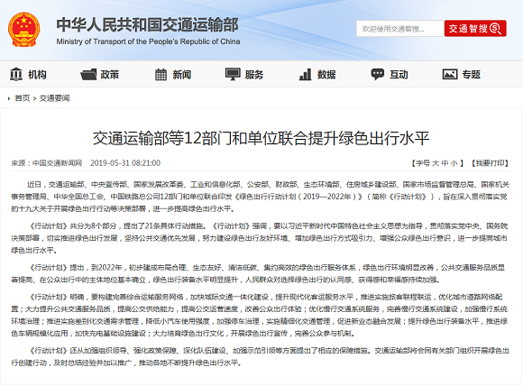 近日,交通运输部、中央宣传部、国家发展改革委、工业和信息化部、公安部、财政部、生态环境部、住房城乡建设部、国家市场监督管理总局、国家机关事务管理局、中华全国总工会、中国铁路总公司12部门和单位联合印发《绿色出行行动计划(2019—2022年)》(简称《行动计划》),旨在深入贯彻落实党的十九大关于开展绿色出行行动等决策部署,进一步提高绿色出行水平。