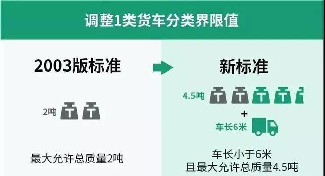 新的车型划分标准中,将1类和2类货车分类界限值,确定为车长小于6米且允许总质量4.5吨。