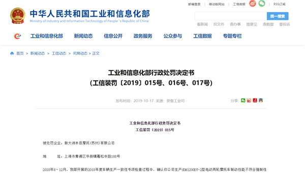 10月17日,工信部官方微信公众号“工信微报”公布行政处罚决定书,对新大洲本田摩托(苏州)有限公司、浙江飞碟汽车制造有限公司、东风柳州汽车有限公司作出行政处罚,责令三家企业分别停止生产和销售相关产品,并进行为期6个月的整改。