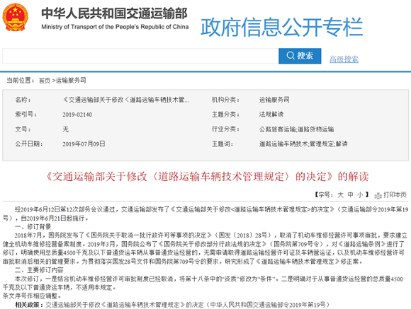 7月9日,交通运输部发布了《交通运输部关于修改〈道路运输车辆技术管理规定〉的决定》(以下简称《决定》)并做出了相关解读,明确了使用总质量4500千克及以下普通货运车辆从事普通货运经营的,无需申请取得道路运输经营许可证及车辆营运证,以及机动车维修经营许可审批取消后相关的管理要求。