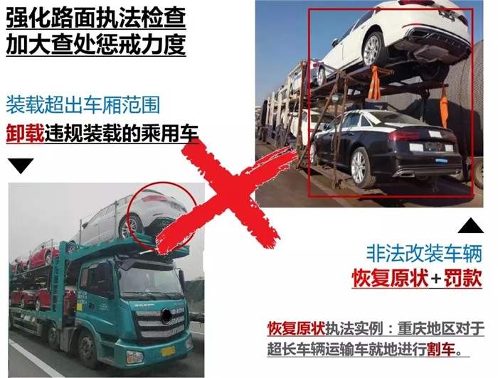 各地公安交通管理部门、交通运输主管部门要按照《关于深入推进车辆运输车治理工作的通知》(交办运函〔2018〕702号)的要求,强化路面执法检查,重点加强对车辆运输车“6+2”“7+2”超长违法运输行为的查处,一经发现,严格依据《中华人民共和国道路交通安全法》《中华人民共和国道路交通安全法实施条例》《机动车登记规定》相关规定进行处罚。对于非法改装的车辆运输车,责令恢复原状,并处警告或五百元以下罚款;对于装载超出车厢范围的车辆运输车,责令卸载违规装载的乘用车。各地交通运输主管部门要按照有关规定要求,采取有效措施,禁止“6+2”“7+2”等违法装载的车辆运输车驶入高速公路。