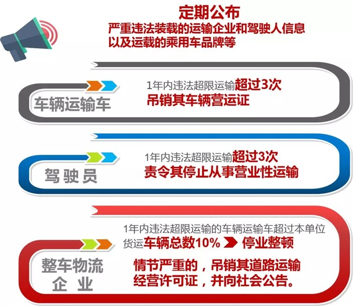 各地公安交通管理部门要重点加强车辆运输车违法信息的收集汇总,包括运载乘用车品牌、发货单位、运输企业和驾驶人等信息,定期报送至公安部交通管理局。公安部交通管理局及时将相关违法信息通报交通运输部运输服务司,交通运输部运输服务司将定期公布严重违法装载的运输企业和驾驶人信息以及运载的乘用车品牌等,并将相关违法信息转发至各地交通运输主管部门。各地交通运输主管部门要按照《公路安全保护条例》相关规定,对1年内违法超限运输超过3次的车辆运输车,吊销其车辆营运证;对1年内违法超限运输超过3次的车辆运输车驾驶人,责令其停止从事营业性运输;整车物流企业1年内违法超限运输的车辆运输车超过本单位货运车辆总数10%的,责令整车物流企业停业整顿;情节严重的,吊销其道路运输经营许可证,并向社会公告。各地交通运输主管部门要及时将处罚结果逐级报送至交通运输部运输服务司,交通运输部运输服务司将定期通报公安部交通管理局、工业和信息化部装备工业司。中国物流与采购联合会等行业协会要积极发挥行业自律作用,建立行业监督举报机制,收集分析整车物流企业相关违法举报信息并予以公布,引导行业规范发展。