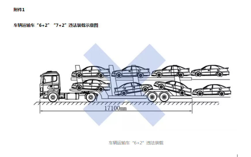 按照交通运输部、公安部、工业和信息化部等五部门联合印发的《车辆运输车治理工作方案》(交办运〔2016〕107号)总体部署,2018年7月1日起全面禁止不合规车辆运输车通行。一年来,在各级交通运输、公安、工业和信息化主管部门的共同努力下,在各乘用车制造企业、整车物流企业、行业协会的积极支持下,整车物流市场秩序逐步规范。但同时,个别地区仍存在车辆运输车违法运输现象,主要表现为半挂车辆运输车在用于装卸的渡板上超长装载乘用车(行业俗称“6+2”“7+2”,示意图见附件1),严重扰乱了整车物流市场秩序。为持续规范车辆运输车装载,巩固治理成效,维护健康规范有序的市场环境,现就进一步加强车辆运输车超长违法运输治理工作通知如下: