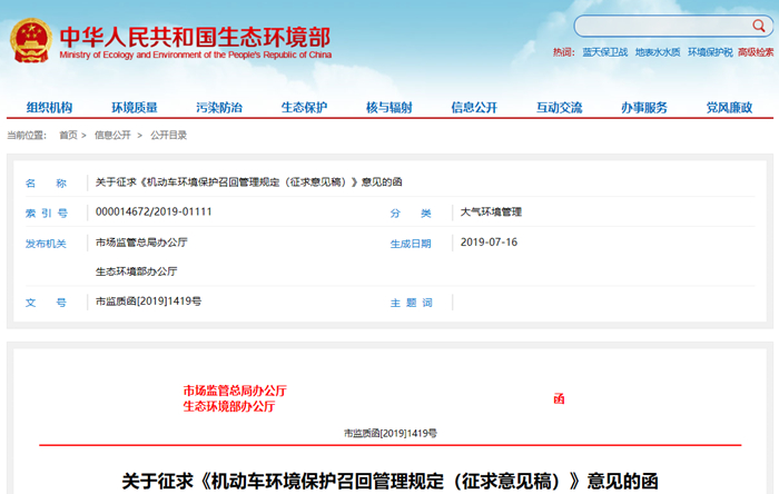 近日,中国人民共和国生态环境部下发关于征求《机动车环境保护召回管理规定(征求意见稿)》意见的函,并向各个相关单位征求意见,所提意见须于2019年8月19日前反馈。