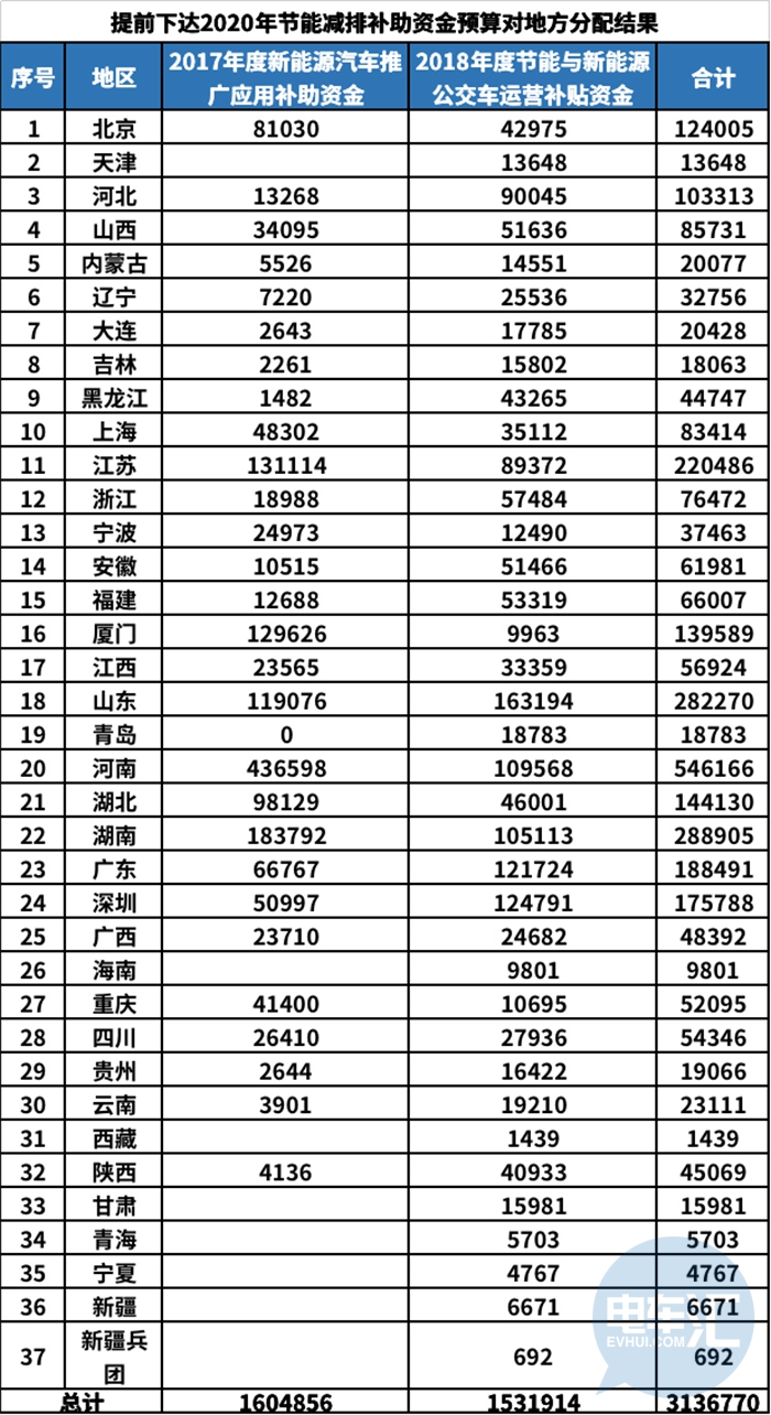11月20日,财政部经济建设司发布《提前下达2020年节能减排补助资金预算对地方分配结果》。结果显示,全国36个省市加新疆兵团2017年度新能源汽车推广应用补助资金达1604856万元,2018年度节能与新能源公交车运营补贴资金达1531914万元,合计3136770万元。