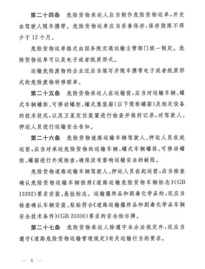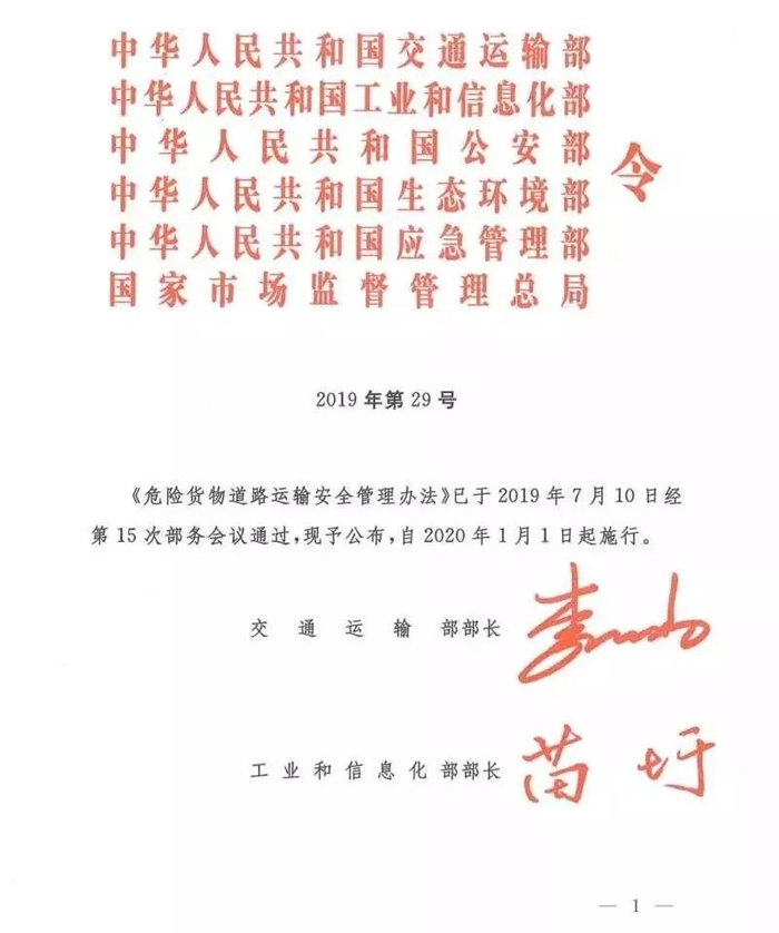 11月25日,交通运输部、工业和信息化部、公安部、生态环境部、应急管理部、市场监督管理总局联合发布了《危险货物道路运输安全管理办法》(交通运输部令2019年第29号,以下简称《办法》)正式发布,该法规自2020年1月1日起执行。
