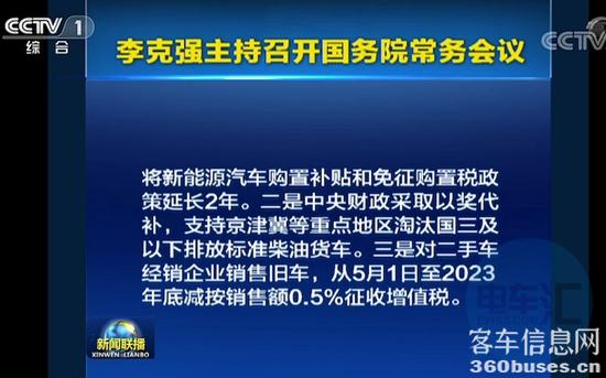 3月31日,国务院总理李克强主持召开国务院常务会议,会议指出,为促进汽车消费,会议确定,一是将新能源汽车购置补贴和免征购置税政策延长2年。二是中央财政采取以奖代补,支持京津冀等重点地区淘汰国三及以下排放标准柴油货车。三是对二手车经销企业销售旧车,从5月1日至2023年底减按销售额0.5%征收增值税。