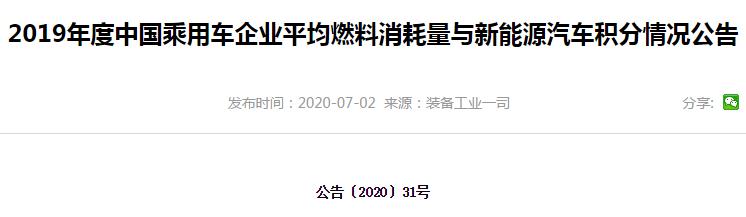 7月2日,工信部发布《2019年度中国乘用车企业平均燃料消耗量与新能源汽车积分情况公告》。