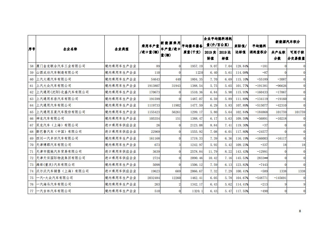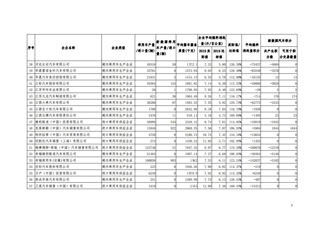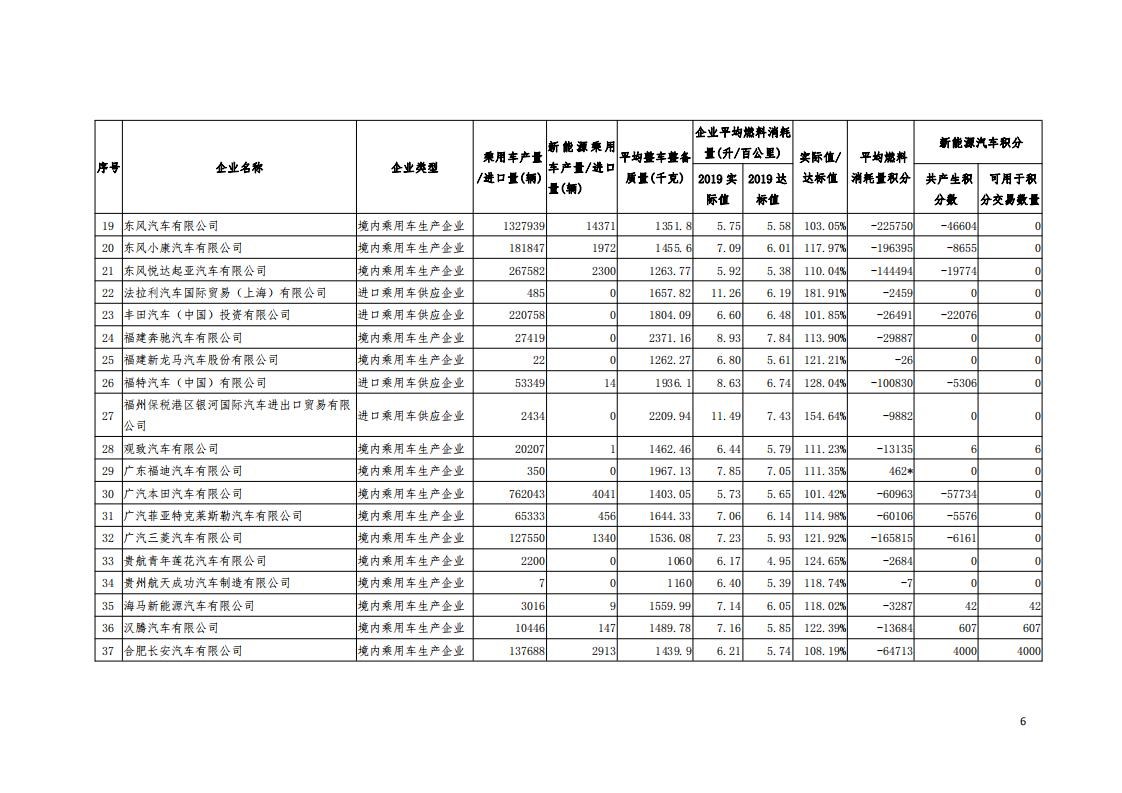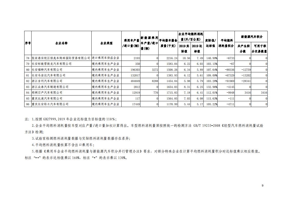 2019年度中国乘用车企业平均燃料消耗量与新能源汽车积分情况公告