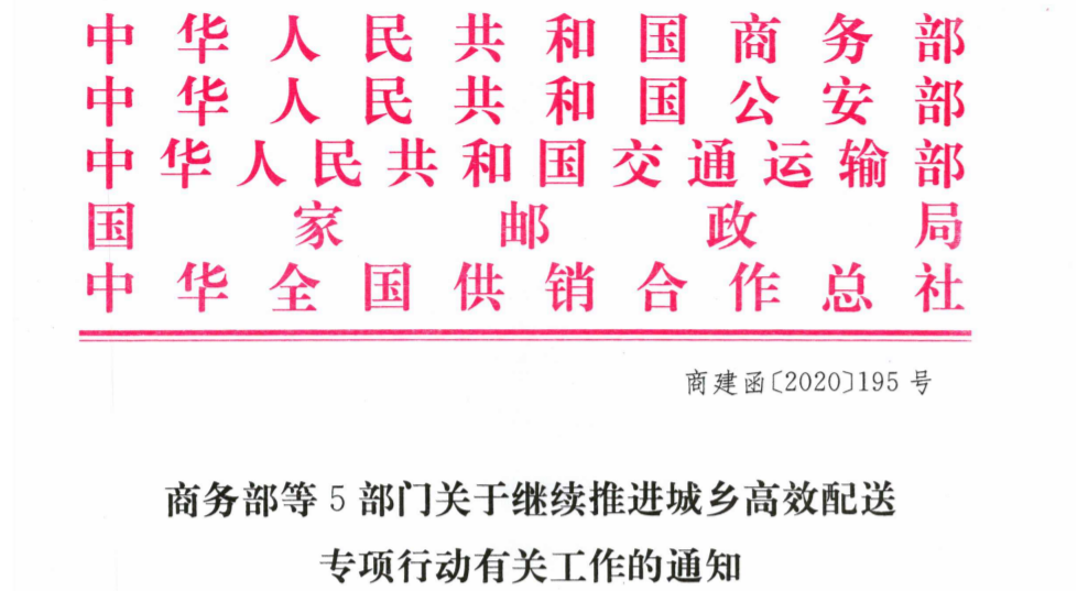 5部门联合印发《关于继续推进城乡高效配送专项行动有关工作的通知》