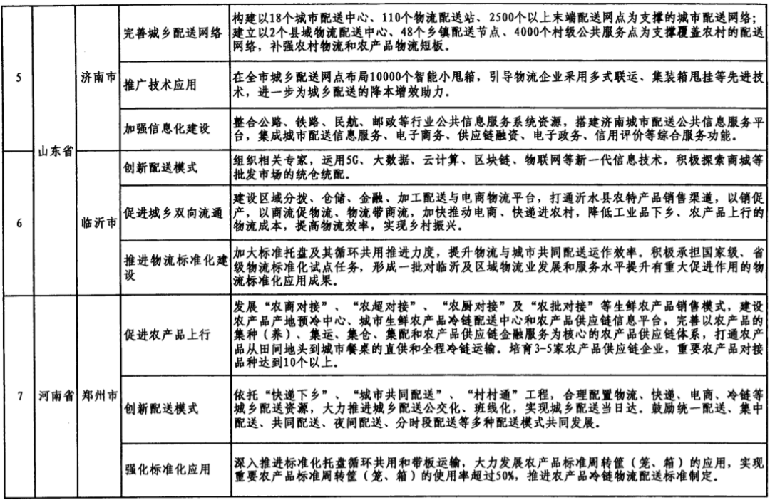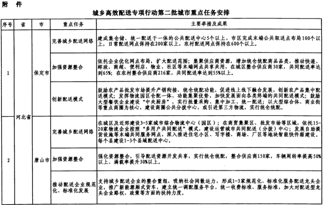 近日,商务部等5部门联合印发《关于继续推进城乡高效配送专项行动有关工作的通知》,明确了城乡高效配送专项行动第二批10个城市(保定、唐山、通化、南昌、济南、临沂、郑州、洛阳、泸州、遂宁)的专项行动目标、任务和具体举措,进一步提升了专项行动的针对性和有效性。