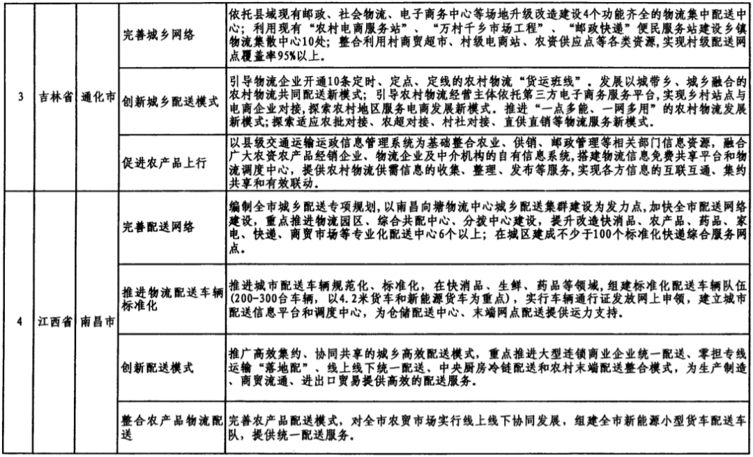 通知要求,各地要进一步强化城乡配送工作协调机制;要进一步强化城乡高效配送专项行动的城市主体责任,重点在推进物流配送车辆标准化、促进农产品上行和城乡双向流通等方面加强探索创新。