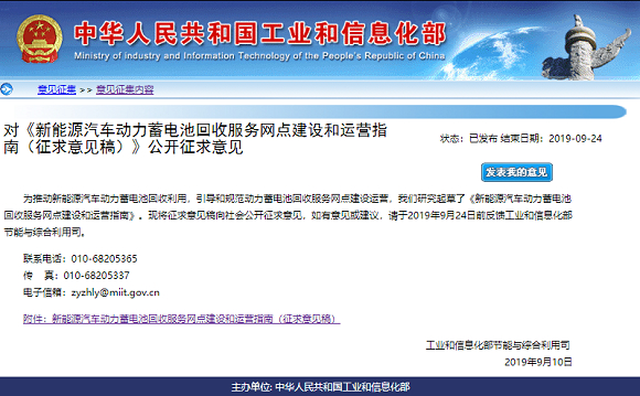 为推动新能源汽车动力蓄电池回收利用,引导和规范动力蓄电池回收服务网点建设运营,工业和信息化部节能与综合利用司9月10日发布《新能源汽车动力蓄电池回收服务网点建设和运营指南(征求意见稿)》。 [详细]