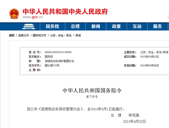 国务院发布报废机动车回收管理办法 6月1日起施行