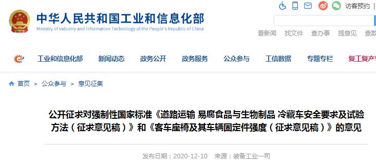 12月10日,工信部公开征求对强制性国家标准《道路运输 易腐食品与生物制品 冷藏车安全要求及试验方法(征求意见稿)》和《客车座椅及其车辆固定件强度(征求意见稿)》的意见。