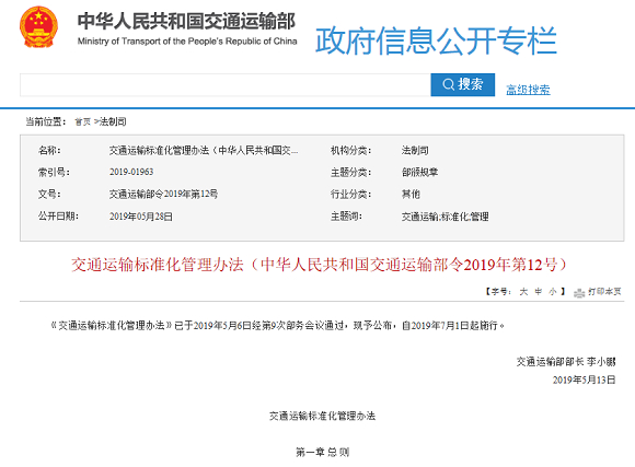 为规范交通运输标准化工作,提升产品和服务质量,促进交通运输行业高质量发展,依据《中华人民共和国标准化法》,交通部发布交通运输标准化管理办法(中华人民共和国交通运输部令2019年第12号),该办法自2019年7月1日起施行。 [详细]