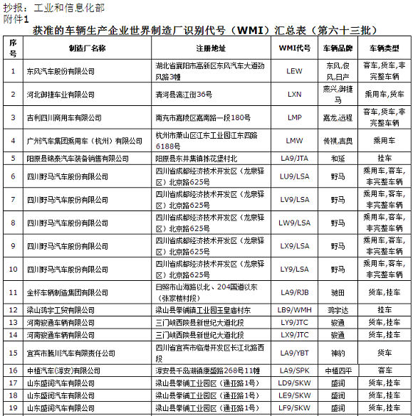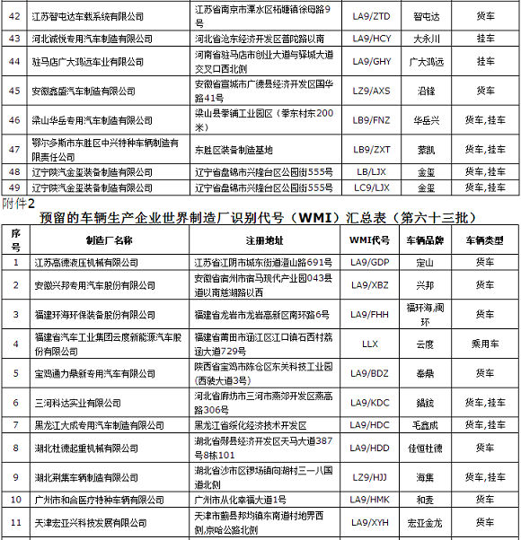 关于公布世界制造厂识别代号(WMI)的通知(第六十三